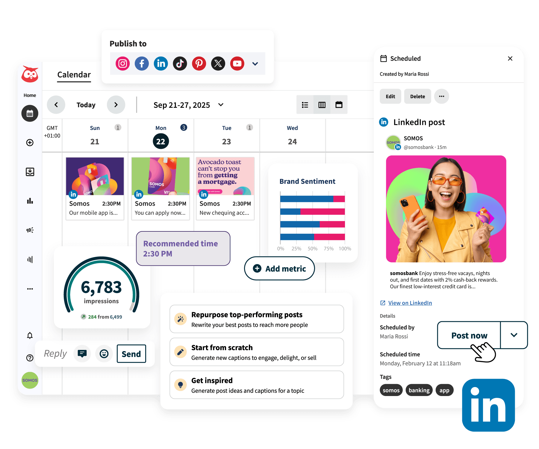 Veröffentlichen, planen und analysieren Sie LinkedIn-Inhalte auf einem einzigen Tab. Maximieren Sie Reichweite und Interaktion mit weniger Aufwand, in kürzester Zeit.