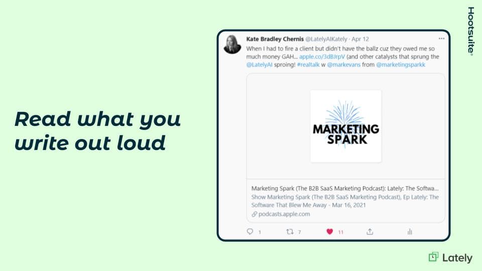 Pro tip: Avoid “resting bitch face” in your writing by reading your posts out loud. While reading, emphasize what's there and try to feel how it comes out of your mouth, because reading in your head can sound much different. In social you don’t have the same copy tools, like bold or italics, as say an email, so using visuals really come in to aid the importance of what you’re saying.