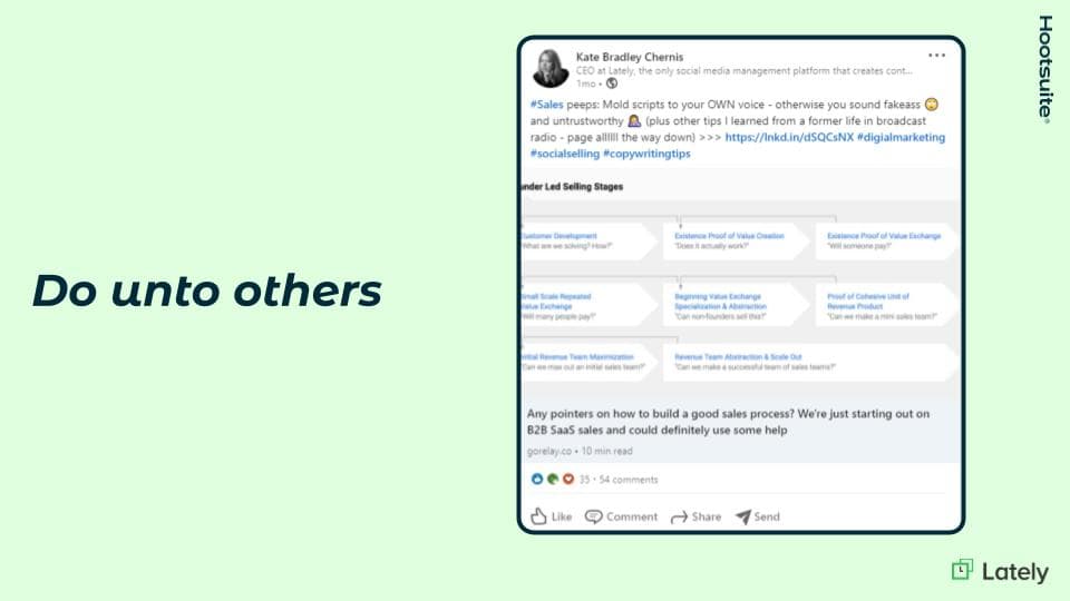 The post is calling out a specific group of people, ie. Sales peeps. Kate is writing this in her own style making it sound human and relatable, not a brand. Remember, people like interacting with people.