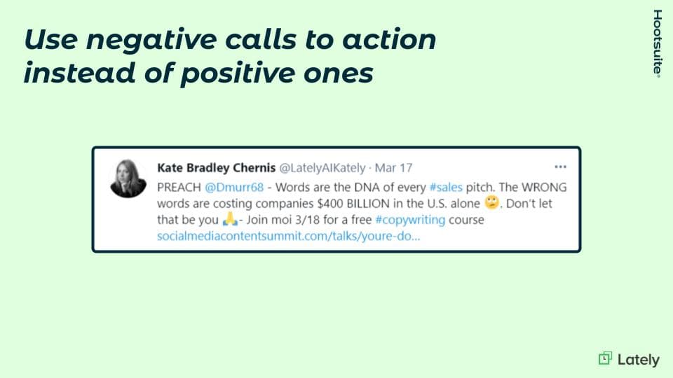 This post is full of negativity, but in the best way. Let’s break it down. It starts off building authority with the statement, “Words are the DNA of every sales pitch”, then immediately going into another more negative statement, “The wrong words are costing companies $400 billion in the US alone”. By using the word “wrong”, immediately forces the reader to question their own work. Followed by the negative call to action, “Don’t let that be you.” It’s barely even a CTA at all but it hits the reader on an emotional level and creates a pain point. So as the reader, you’re feeling a sense of FOMO and questioning whether or not your own work is costing your company money. Where the post pulls you in is following up the negative with a solution. “Join moi for a free course”. Of course, you want to join this course, otherwise you may end up being part of the group that costs companies billions!