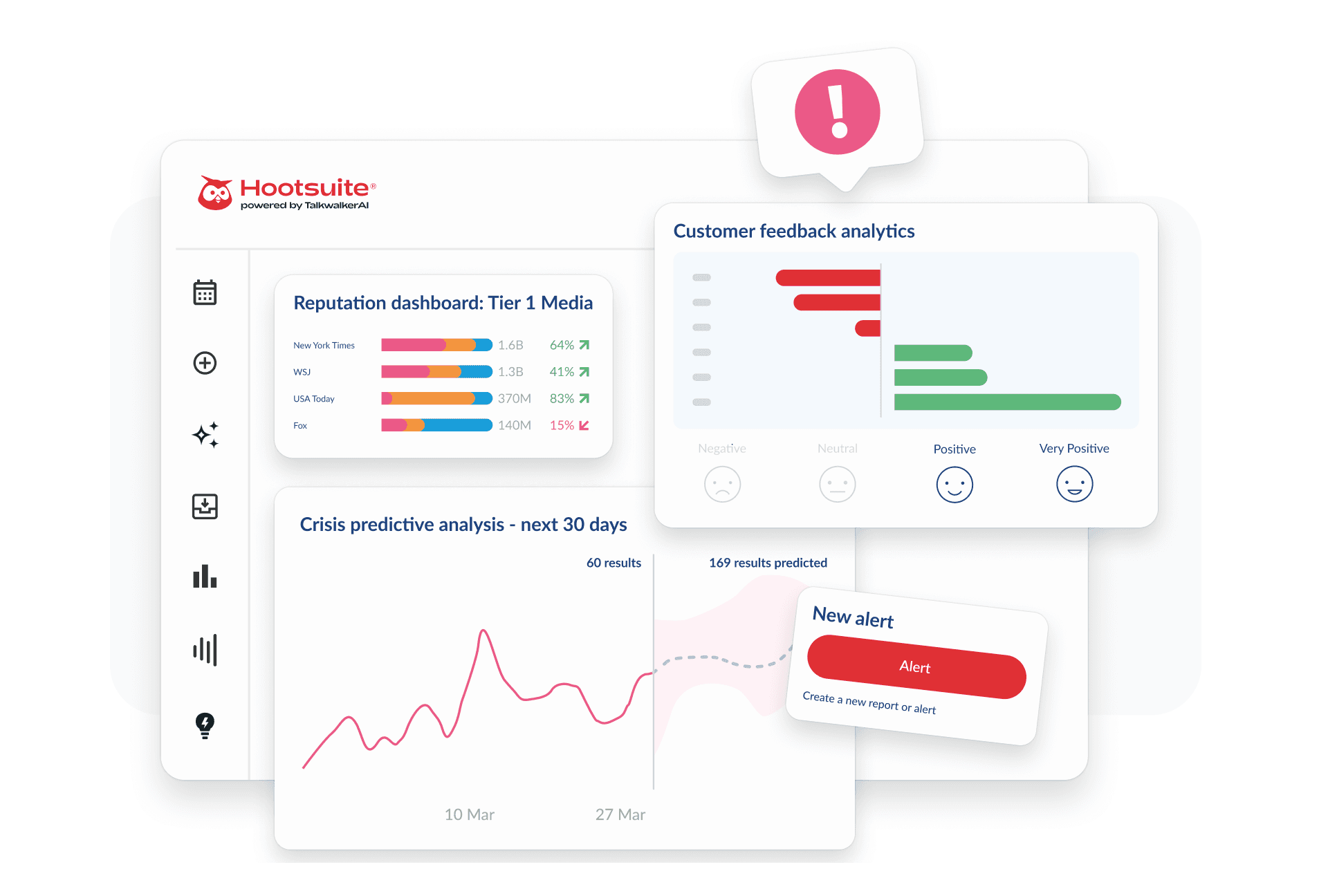 Hootsuite, qui repose sur l'IA de Talkwalker, surveille la réputation de la marque en suivant des millions de conversations sur les médias sociaux, les actualités, les blogs, les forums et les sites d'avis en temps réel. L'IA BlueSilk™ analyse le sentiment, détecte les pics d'activité inhabituels et met en évidence les risques émergents avant qu'ils ne s'aggravent. Grâce à des tableaux de bord unifiés, à du benchmarking concurrentiel et à des alertes automatisées, vous disposez d'une vue complète et permanente de la manière dont votre marque est perçue sur tous les canaux.