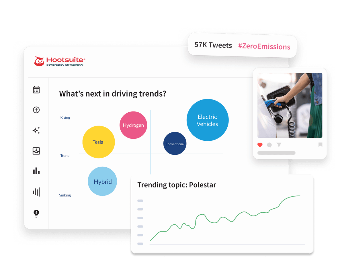 Passez de la réaction aux tendances à la planification de l'avenir en toute confiance. Hootsuite, qui repose sur l'IA de Talkwalker, analyse les données historiques et en temps réel pour identifier les premiers signaux indiquant quels sujets, hashtags et thèmes sont susceptibles de gagner en popularité.