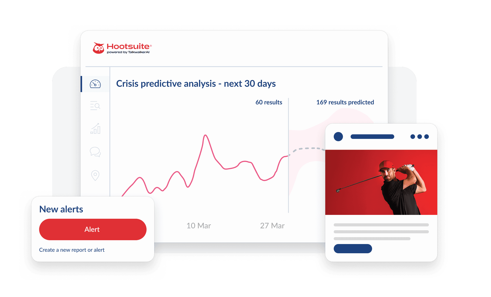 Hootsuite dashboard showing crisis predictive analysis with line graph, alert options, and 30-day forecast displaying 60 current and 169 predicted results