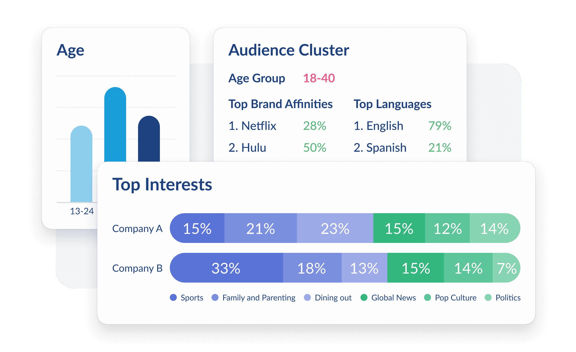 Audience demographics dashboard showing age 18-40, brand preferences for Netflix and Hulu, language usage, and interest distribution across companies.