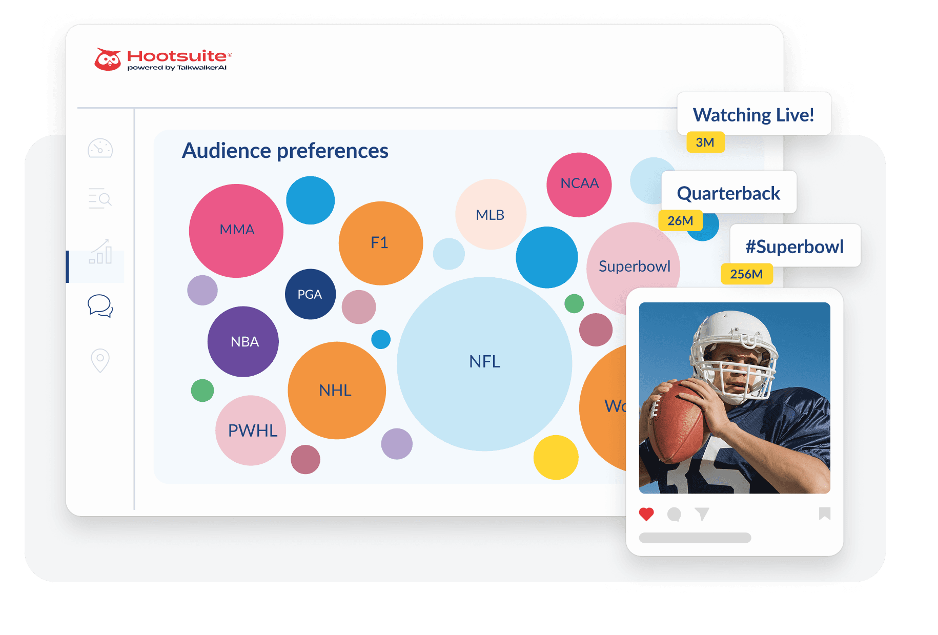 With Hootsuite powered by Talkwalker AI for Sports, you get the clarity to engage fans, prove sponsorship value, and stay ahead on and off the field.