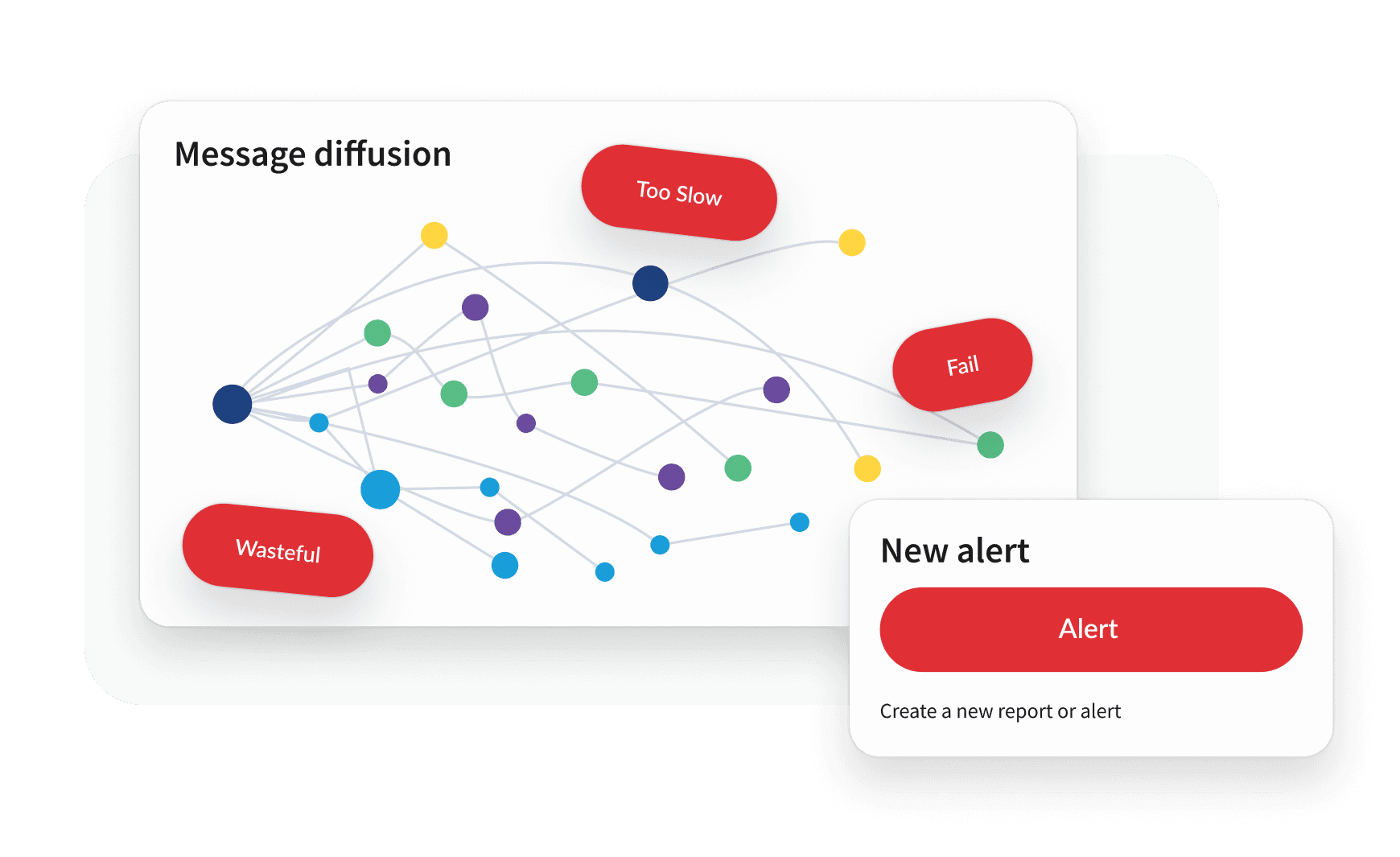 Hootsuite dashboard showing a Message Diffusion network graph with colored nodes and red alert labels reading Too Slow, Fail, and Wasteful.