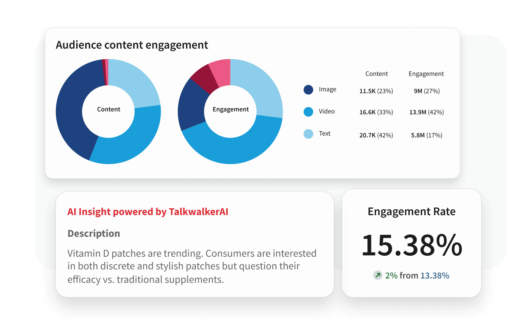 Talkwalker AI dashboard showing Vitamin D patch trends, channel growth, 9.5M engagement, 72.9% positive sentiment, and mentions over time chart.