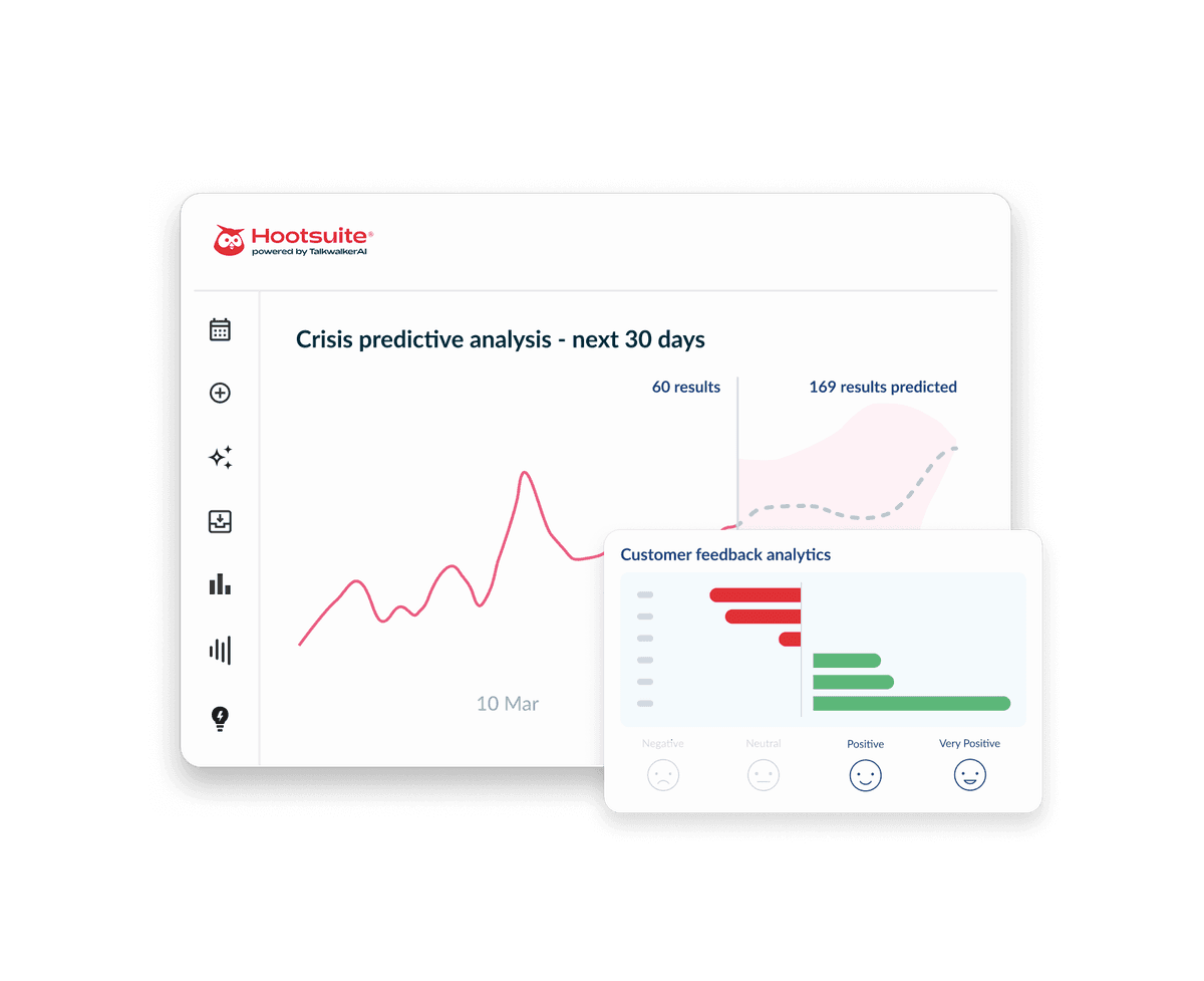 O Hootsuite com o Talkwalker AI monitora a reputação da marca ao acompanhar milhões de conversas em mídias sociais, notícias, blogs, fóruns e sites de avaliação em tempo real. O Blue Silk™ AI analisa o sentimento, detecta picos incomuns de atividade e destaca riscos emergentes antes que se agravem. Com painéis de controle unificados, benchmarking competitivo e alertas automatizados, obtém-se uma visão completa e permanente de como sua marca está sendo percebida em todos os canais.